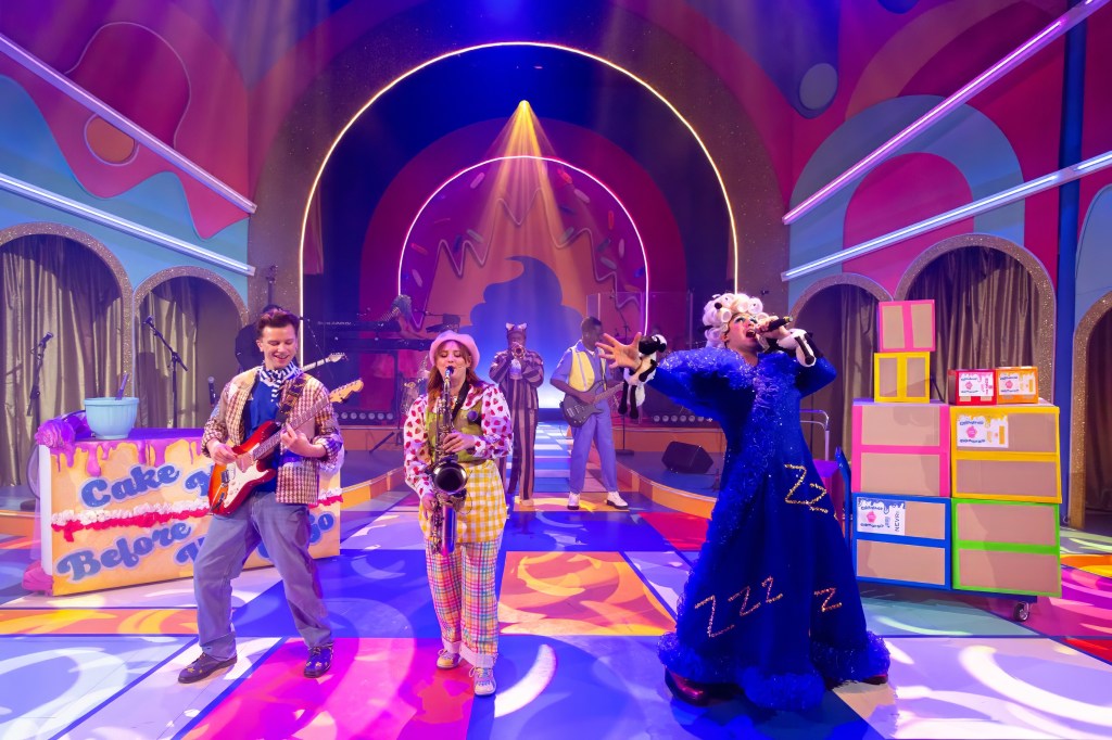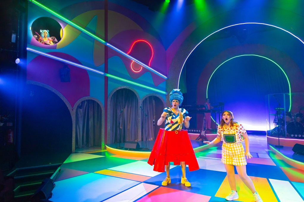 The stage of the New Wolsey has been transformed, with cool candy colours and gold glittery arches, to transport us from Ipswich to London, via the A12 and the Big Tesco at Copdock, where Dick meets up with Cat, who longs for an owner and a name. Cat thinks he’s found ‘his human’ and if he tags along he’ll get a home and that elusive name he wants.