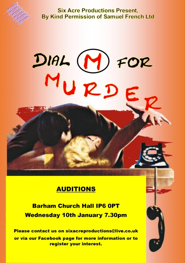 Six Acre Productions are holding auditions for their next show, Dial M for Murder, tomorrow Wednesday 10th January at Barham Church Hall.