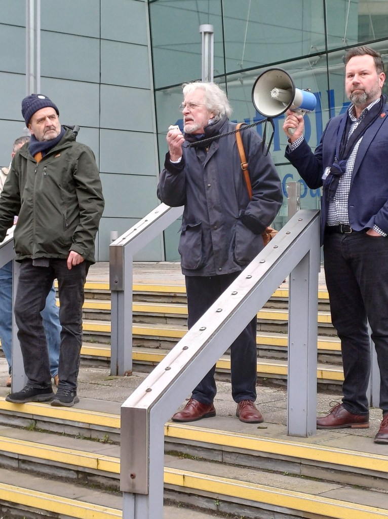 Original Wolsey actor Brian Theodore Ralph addressing the Save Suffolks Arts protestors at SCC headquarters Endeavour House – photo credit Andrew Clarke