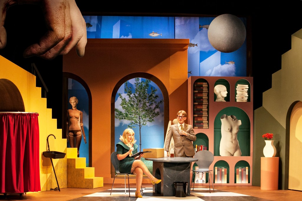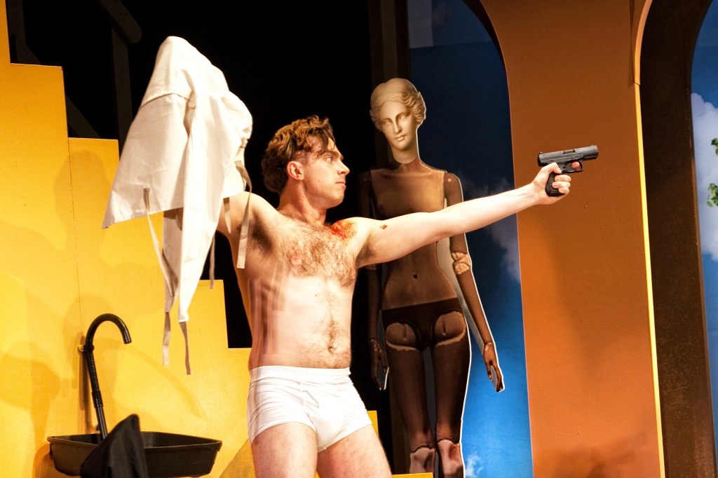 In my opinion you could never set this play in any other time than it was written. There are references to gender, society’s attitudes to women and nods to the Second World War and particularly Winston Churchill ( and a particular part of Winston Churchill), that just wouldn’t sit well if you were to try and modernise the setting. To this end the set design was a riot of 60’s pop art images, cut and paste on a brightly coloured, cartoon like background with a heavy Monty Python influence and was one of the most stunning things about the whole production. This play is a ‘cartoon’, the characters are exaggerated and the situation ludicrous. But even so, the audience just couldn’t relax and allow themselves to be totally taken in, because the dialogue is just too much for our tastes now.