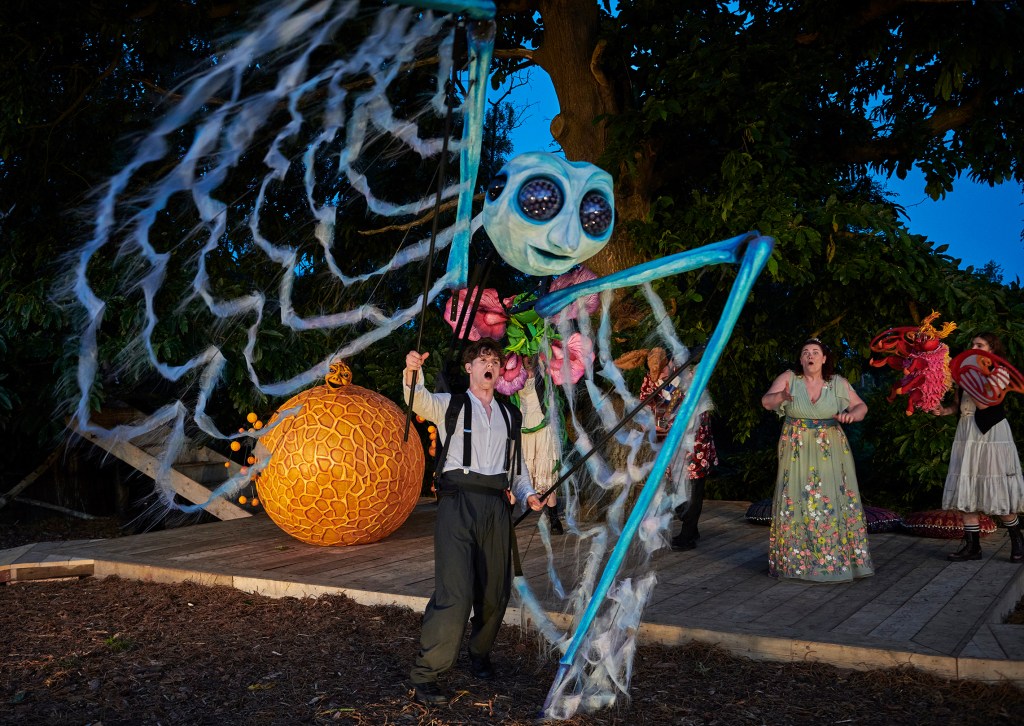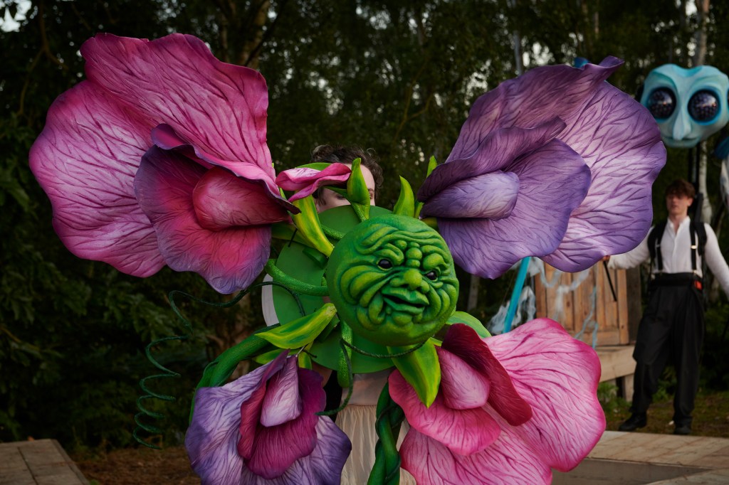 Best of all for me were the puppets, by Nick Barnes Puppets. Mustardseed bouncing like a giant 70s spacehopper, Cobweb striding magnificently through the woods, Peasblossom with a face like a grumpy cabbage sprouting petals of purple and pink and multi-coloured Moth in oversized glasses fluttering on Titania arm. They were a sheer delight and I found myself gasping and clapping like a child again when they came on.