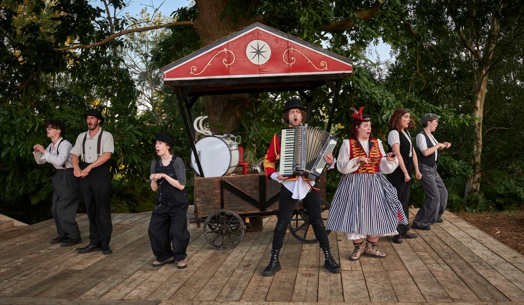 Joanna Carrick, artistic director of the whole company, director of this piece and writer of the original songs, which added so much charm and texture in the show, uses the whole playing area brilliantly. Every aisle is an entrance and exit from behind the audience, through the forest or up on a raised platform. You felt immersed in the show and the actors talk to the audience and involved us all the time. We were part of the company and the action.