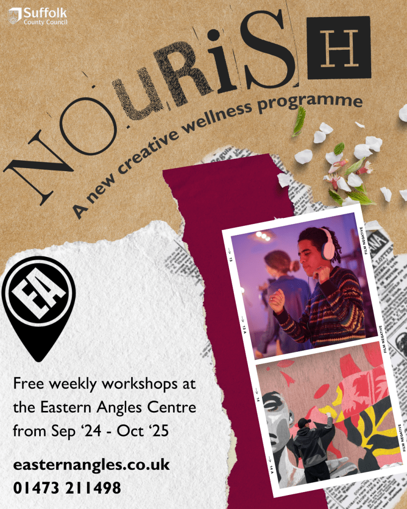 Nourish workshops run every Wednesday 10.30am-12.30pm at the Eastern Angles Centre in Ipswich from 4th September 2024 until 22nd January 2025. For all the latest information and the all-important booking details, visit easternangles.co.uk or phone the Eastern Angles Box Office on 01473 211498.