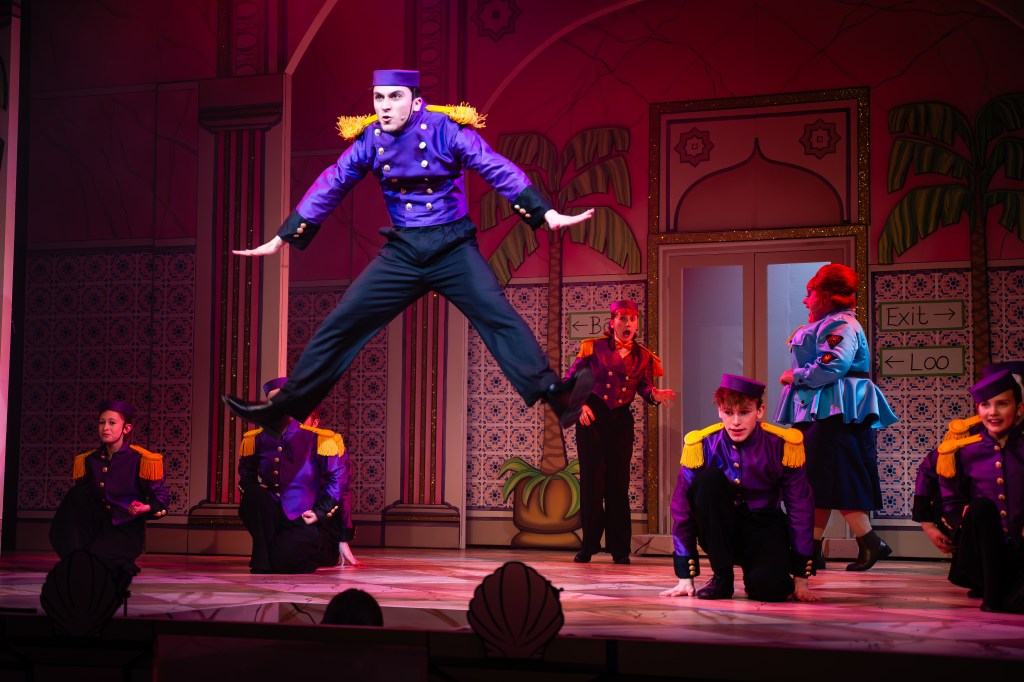 An early scene welcomes us to the Grand Abanazer hotel, a visual treat inspired by Wes Anderson’s The Grand Budapest Hotel. In the lobby, we are greeted by the cast – waking us up to a beautiful morning in this season’s pantoland. It’s also where Aladdin (Samuel Deghkhadirian) works as chief bellhop alongside his overstretched but still very jolly colleague Washy (Ruby Ablett) – all under the watchful command of their ruthless power-hungry boss, Abanazer (David Djemal), the hotelier from hell.