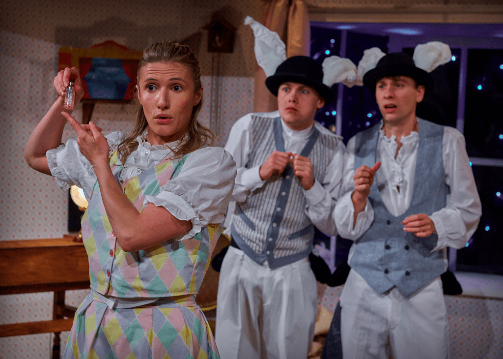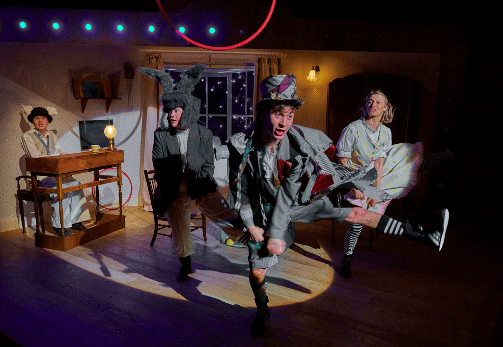 Lewis Carroll’s words and characters are cunningly adapted by Joanna Carrick to work in a limited space with a small cast. There are a few nods to panto but this is definitely not traditional panto. Oh no it isn’t.