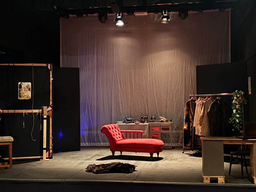 The staging is in equal parts ambitious and odd. I was pleasantly surprised to see some of the play within the play made visible at the back of the stage, but it did also make for some incongruous moments where it suddenly didn’t matter who was and wasn’t on the “actual” stage. There was then the very odd choice to have an invisible door to be used by several of the players, with an awkward accompanying SFX knock firing with varying degrees of success in its timing – particularly jarring with one poor member of the cast left with his hand in the air waiting for the sound.